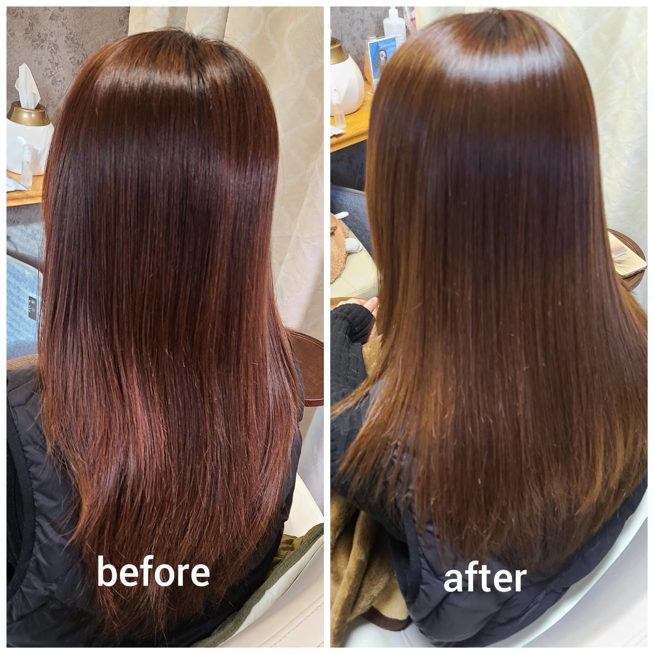 トリートメントは一切使わずに、仕上げは何もつけずに適当に乾かしただけです。ご自宅でのケアも市販の内容成分の薄いシャンプーやコンディショナーで十分です。